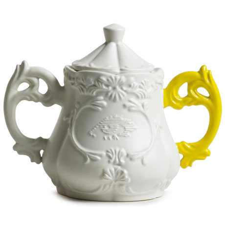 Постмодернистская интерпретация традиций дизайна посуды французского королевского двора XIX века. Коллекция посуды от итальянского бренда Seletti настолько великолепна, что занимает особое место в постоянной экспозиции Музея Искусств и Дизайна в Нью-Йорке. Белая фарфоровая сахарница с яркой желтой ручкой в стиле барокко - великолепный её представитель.