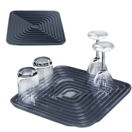 Замечательная сушилка для посуды сделана из специальной мягкой резины, которая не имеет запаха и которая поможет вашим кухонным инструментам и посуде как можно быстрее высохнуть. На поверхности сушилки имеются специальные углубления для воды. Структура этих углублений такова, что не позволяет просочиться воде, оставляя ее в самой сушилке. После того, как ваши приборы высохли, достаточно будет просто слить воду и насухо протереть сушилку.