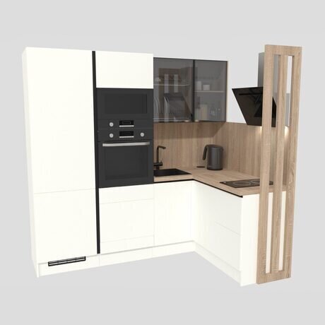 Идеальное решение для малогабаритной кухни: эргономичная угловая компоновка освобождает пространство для движения. Встроенный фартук и выдвижной блок розеток экономят ваш бюджет на отделке и услугах электрика.