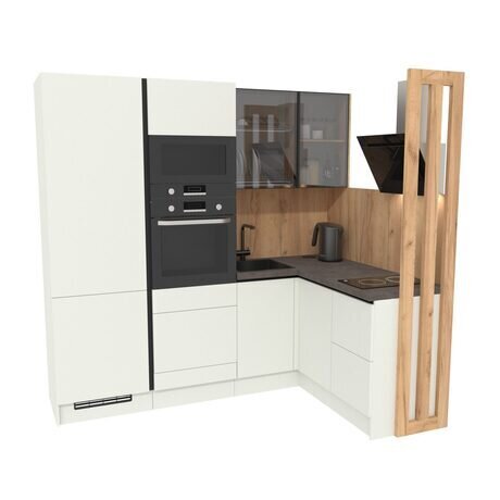 Идеальное решение для малогабаритной кухни: эргономичная угловая компоновка освобождает пространство для движения. Встроенный фартук и выдвижной блок розеток экономят ваш бюджет на отделке и услугах электрика.