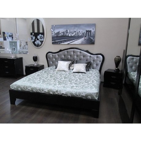 Кровать выполнена в стиле современного Ар деко. Фигурное изголовье декорировано стежкой капитоне. Кровать поставляется с решеткой, без матраса. Размер спального места 180*200 см. Отделка черный блестящий лак, рама изголовья в отделке "под крокодила", ткань серый велюр (Moki-51).